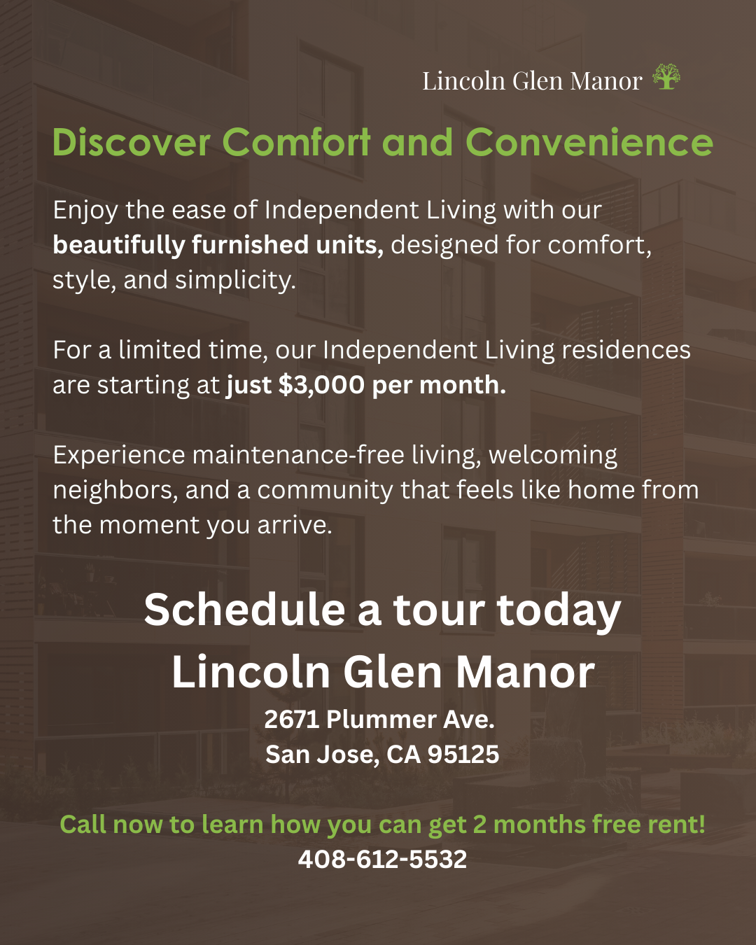 Nestled among six acres in San Jose's Willow Glen neighborhood, Lincoln Glen Manor is dedicated to enhancing the lives of seniors by providing four levels of care.